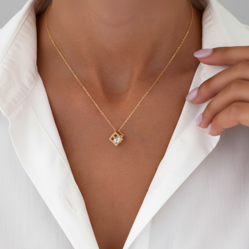 گردنبند مکعب تکنگین با طراحی هندسی و مدرنش، ترکیبی از سادگی و ظرافت را به نمایش میگذارد. نگین درخشان درون قاب مکعبی طلایی قرار گرفته و با هر حرکت، نوری چشمنواز منعکس میکند. این گردنبند انتخابی ایدهآل برای استایلهای مینیمال و شیک روزمره است. ✨