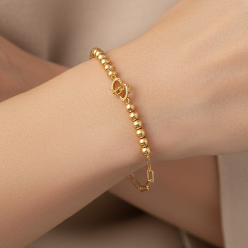 این دستبند ظریف با ترکیب مهرههای براق و زنجیر مستطیلی، جلوهای خاص و مدرن دارد. طراحی متفاوتش باعث میشود هم برای استایلهای روزمره و هم برای موقعیتهای خاص مناسب باشد. وزن سبک و درخشش ظریف آن، حس لوکس و شیکی به مچ دست میبخشد. ✨