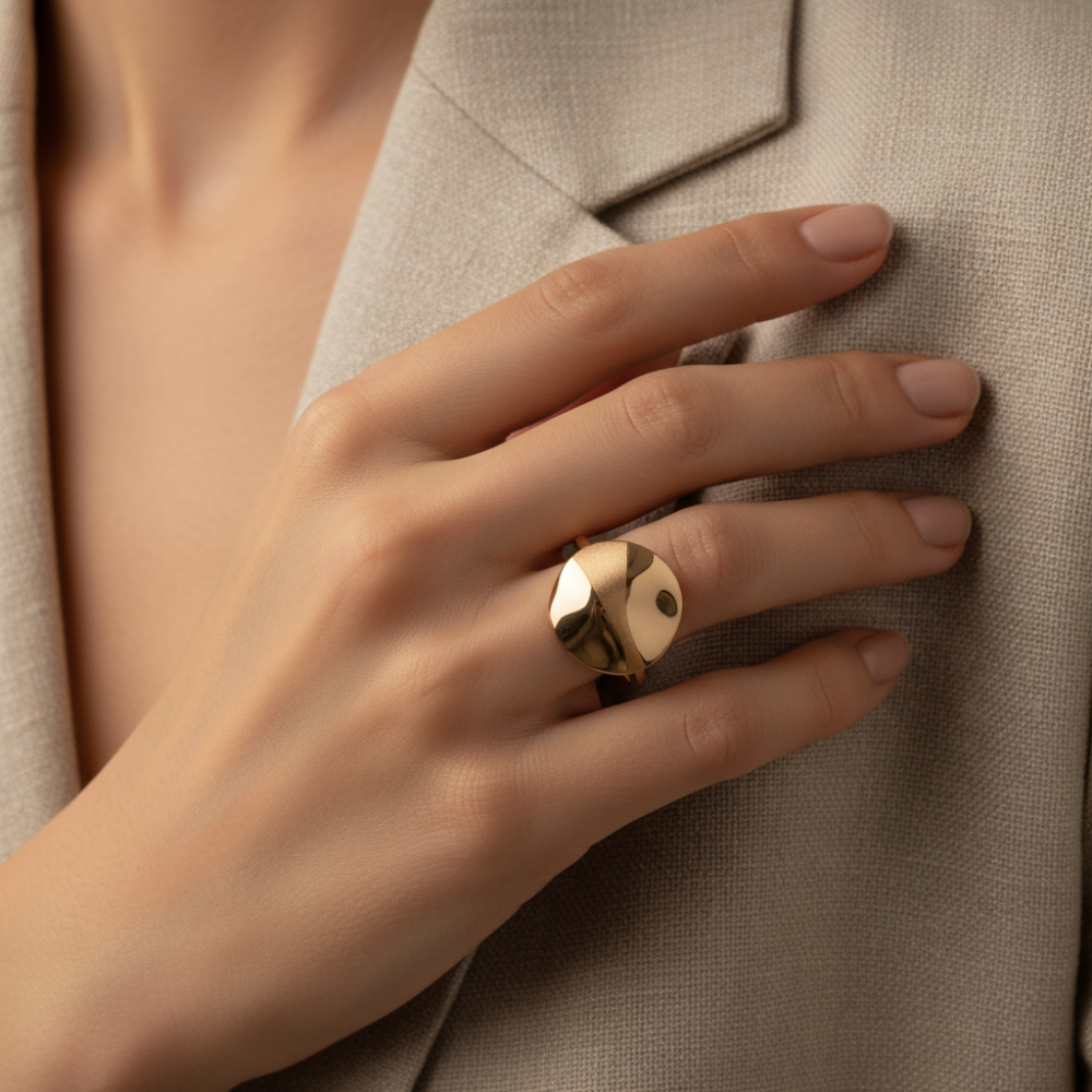 این انگشتر با طراحی منحصربهفرد و سطحی ترکیبی از بافت براق و مات، نمادی از هماهنگی بین لطافت و قدرت است.